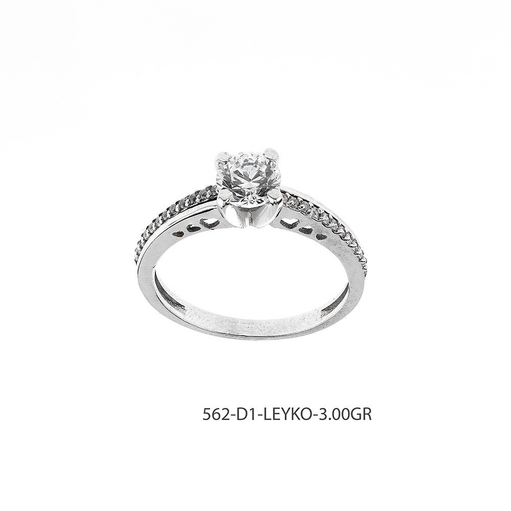 Δαχτυλίδι μονόπετρο από λευκόχρυσο διακοσμημένο με λευκά zircon. Κατασκευάζεται σε 14Κ, 9Κ, 18Κ και σε ασήμι 925. Εργασία χειρός με λουστρέ φινίρισμα.